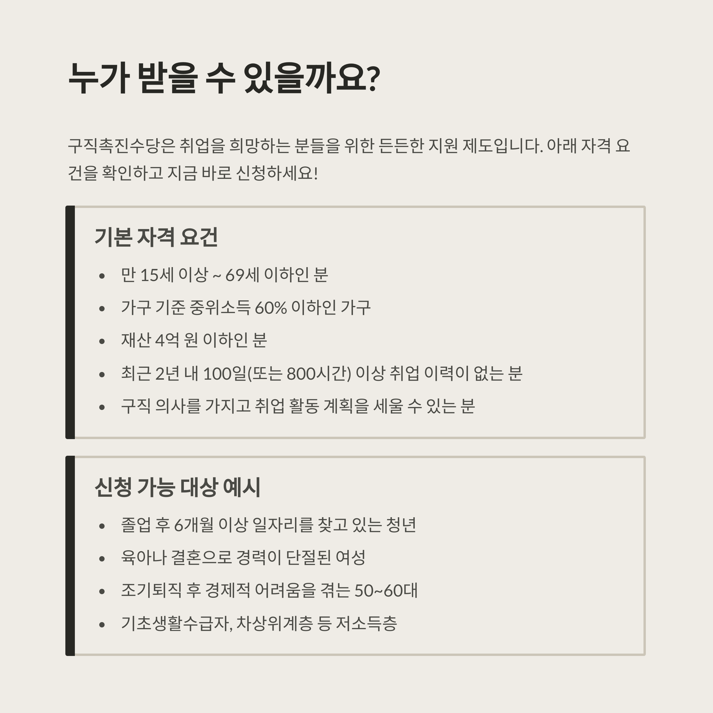 TIP: 구직촉진수당 수급자는 대부분 위 제도에 자동 연계 가능합니다.