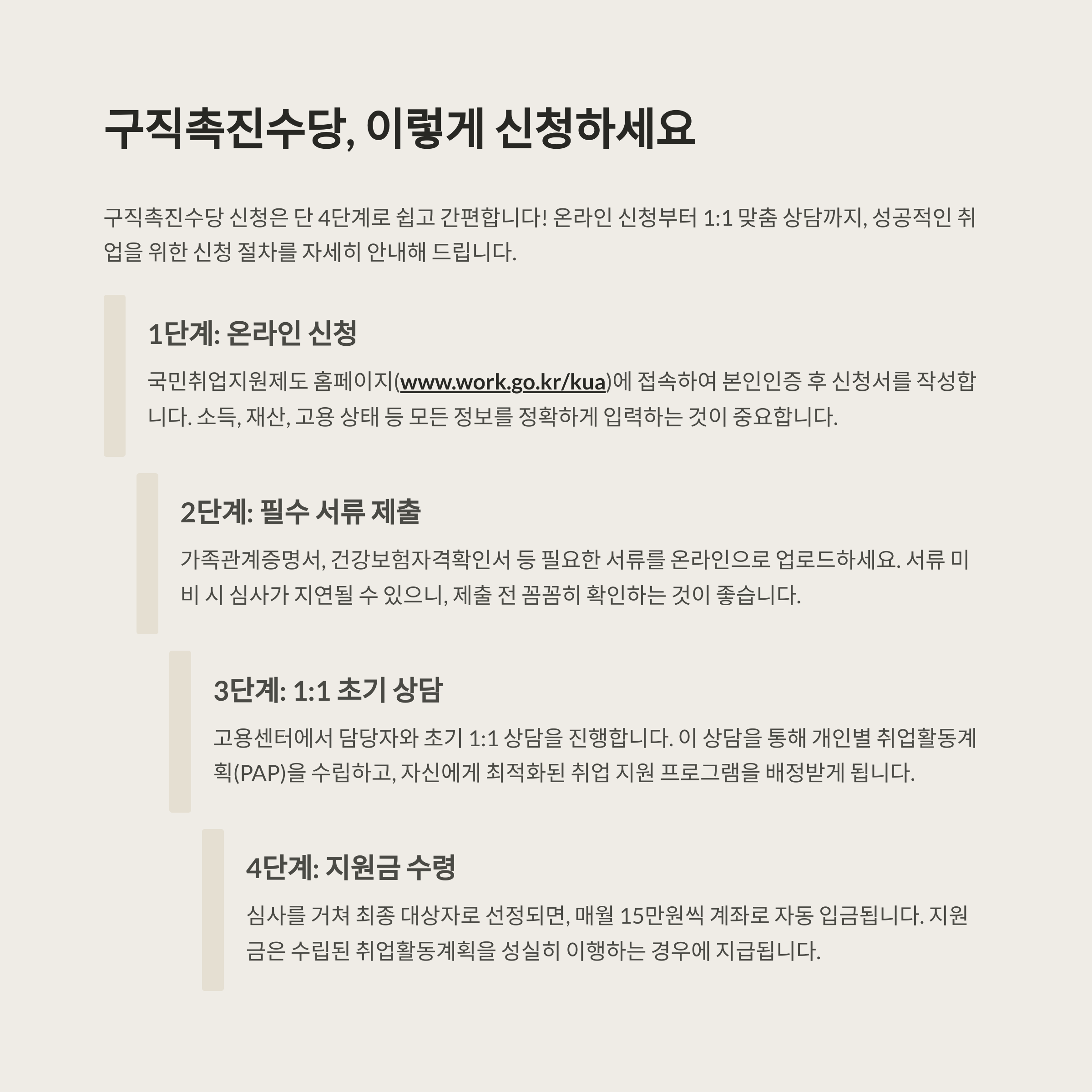 이번 글에서는 구직촉진수당의 지원 대상, 신청 방법, 유지 조건, 주의사항을