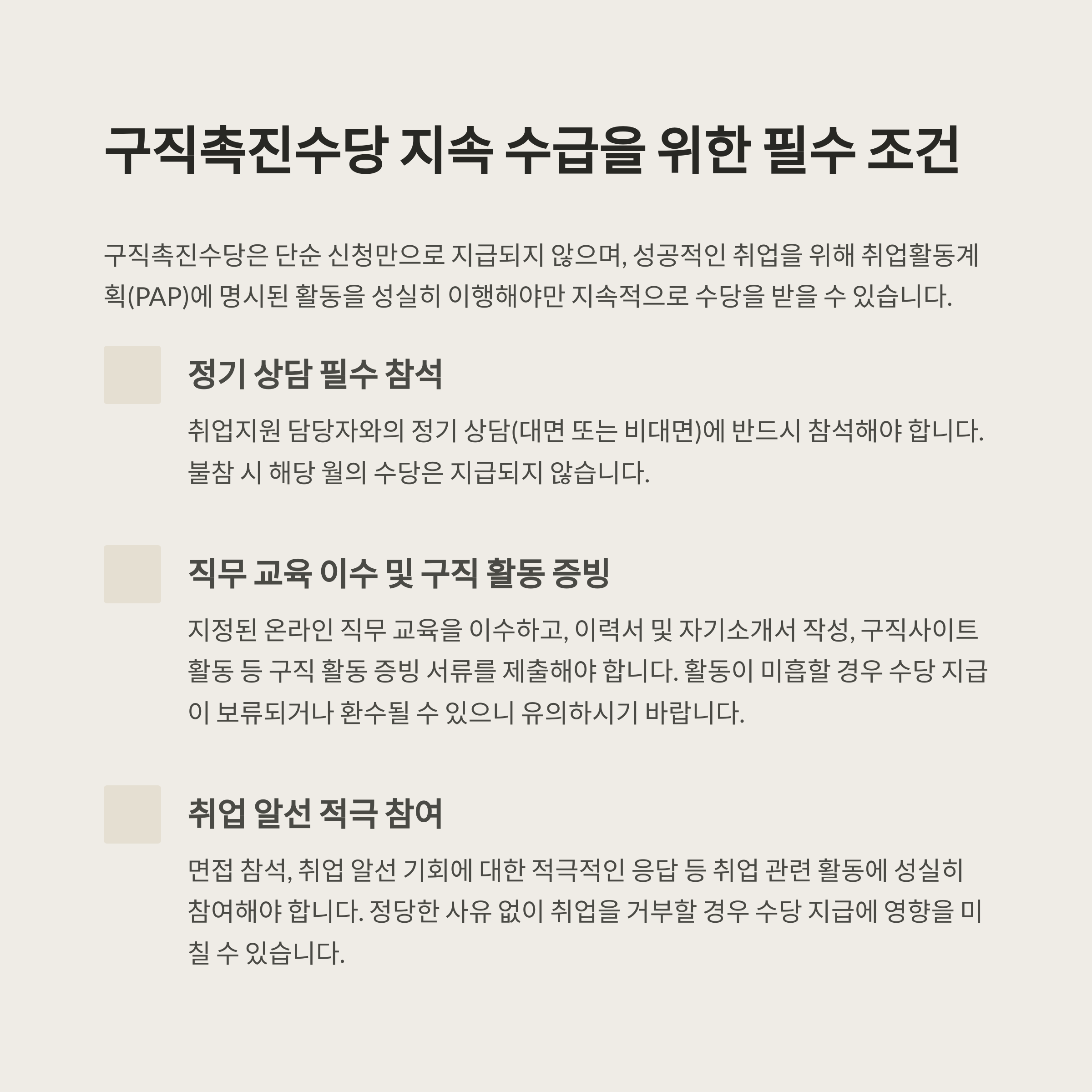 취업활동계획(PAP)에 따라 지정된 활동을 성실히 수행해야 지급이 유지됩니다.