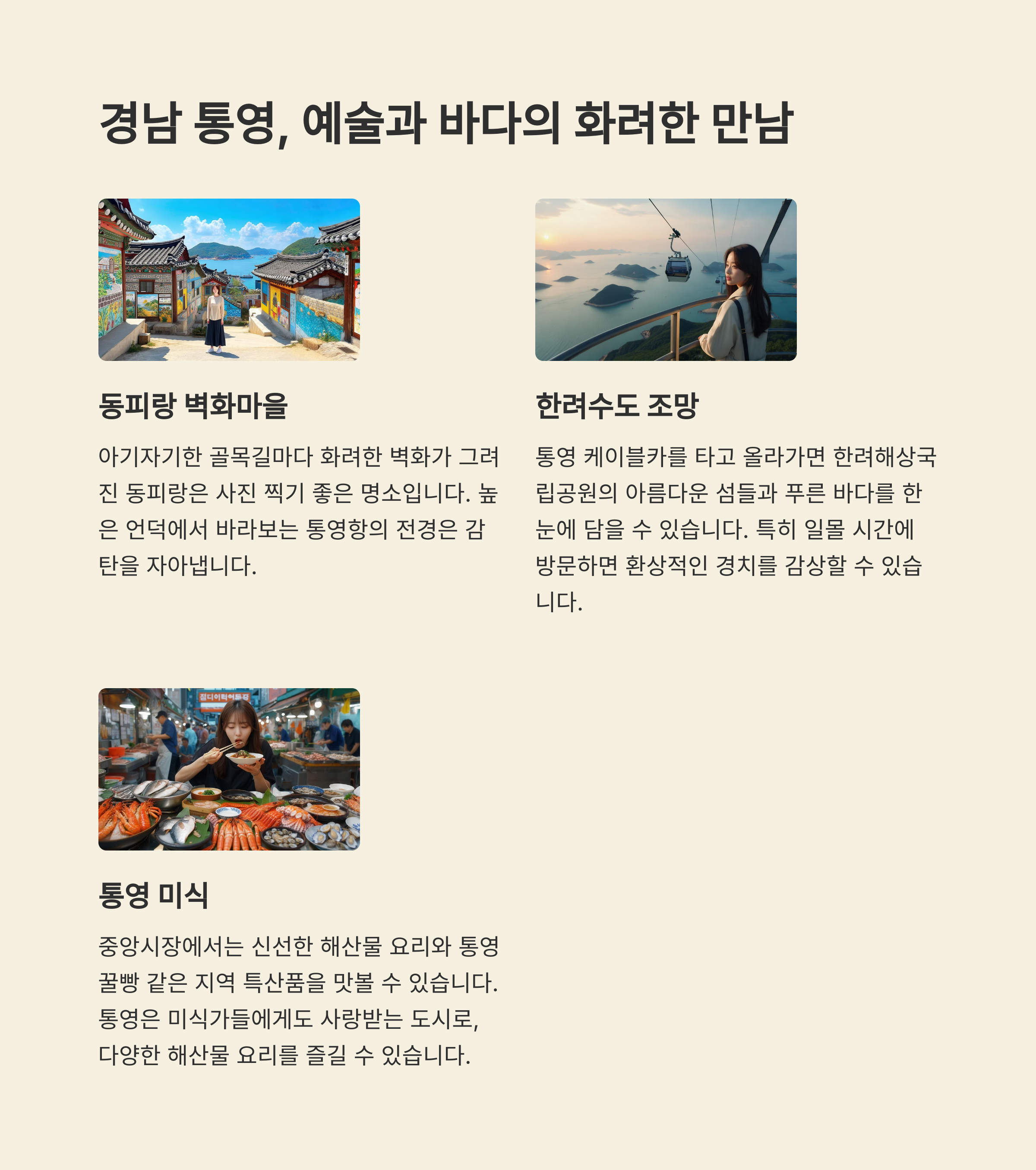 통영은 동피랑 벽화마을, 미륵산 케이블카, 한려수도 조망이 유명합니다.