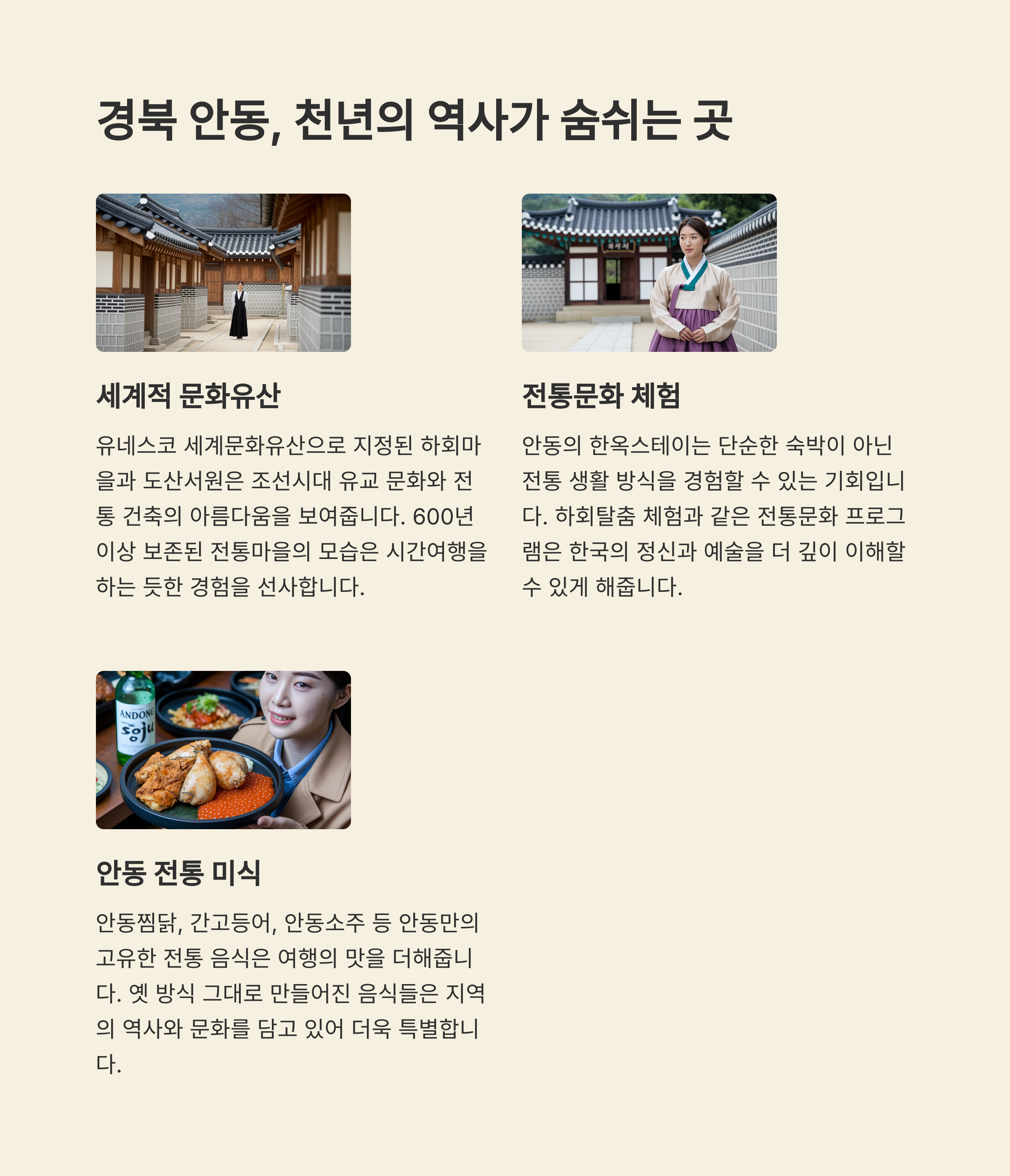 안동은 하회마을과 병산서원으로 한국 전통문화의 진수를 보여줍니다.