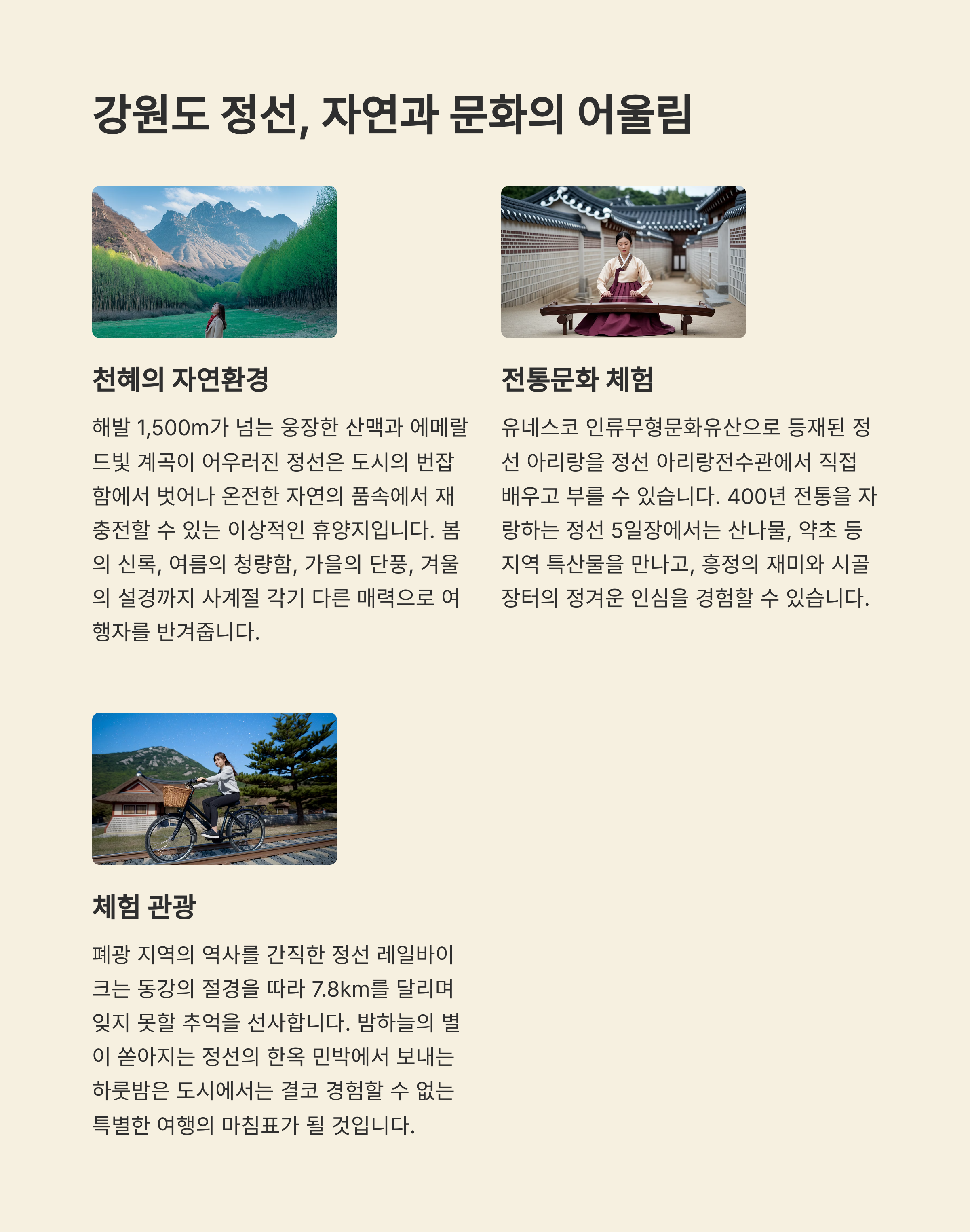 "정선 5일장, 레일바이크, 화암동굴 등 다채로운 매력을 즐길 수 있습니다."