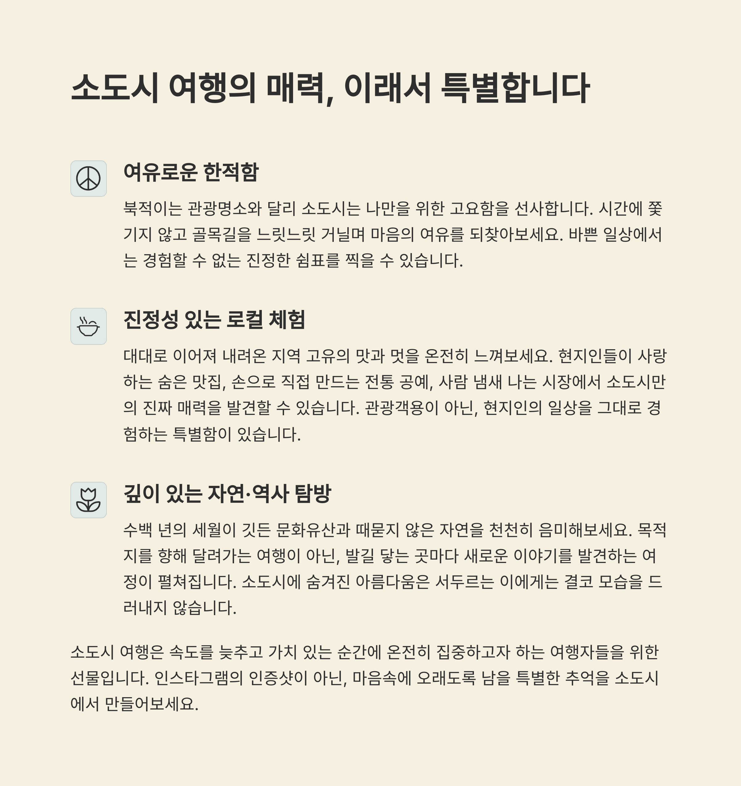 소도시는 여유롭고 깊은 매력을 가진 여행지입니다.