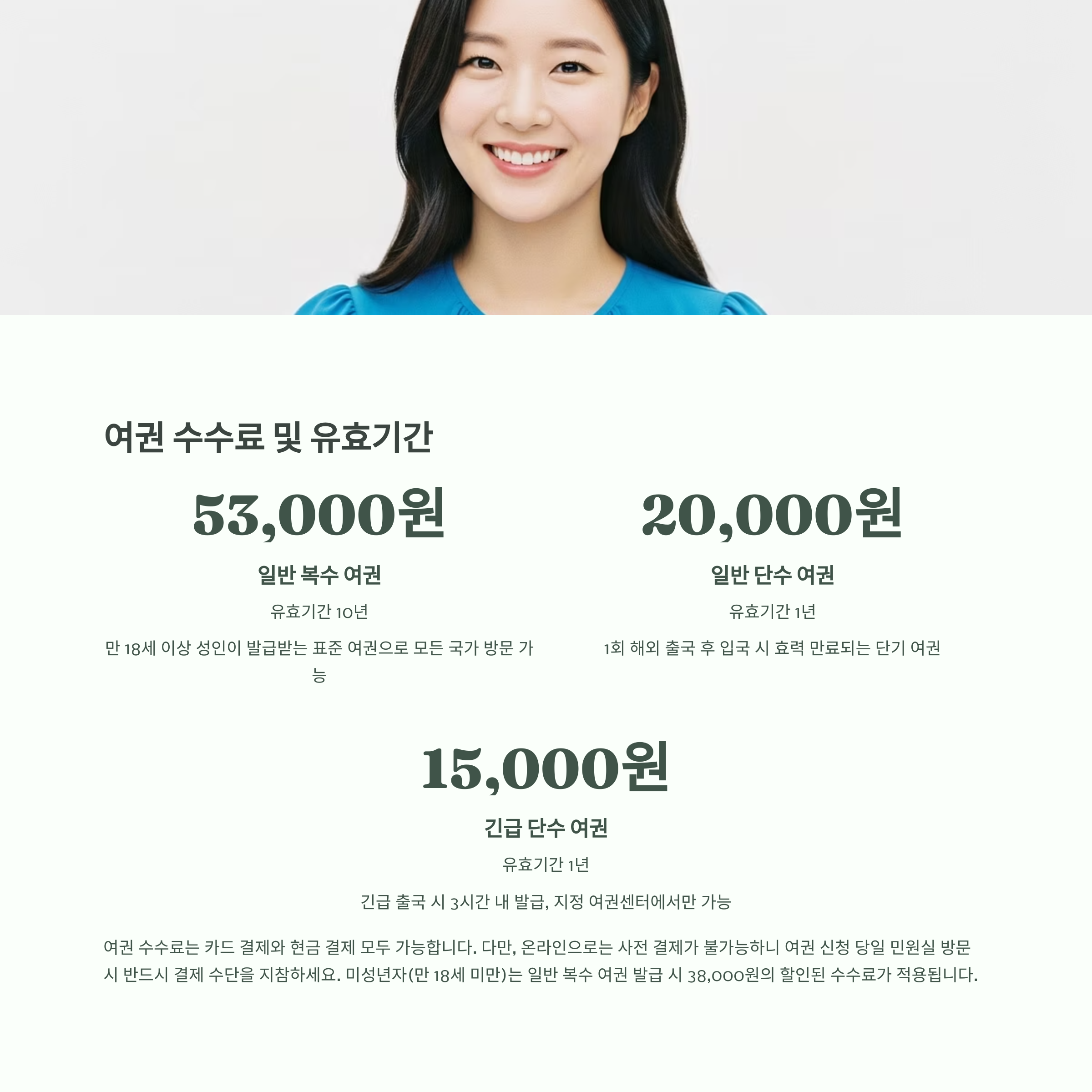 | 긴급 단수 여권 | 당일 출국 | 15,000원 (여권센터 현장 발급) |