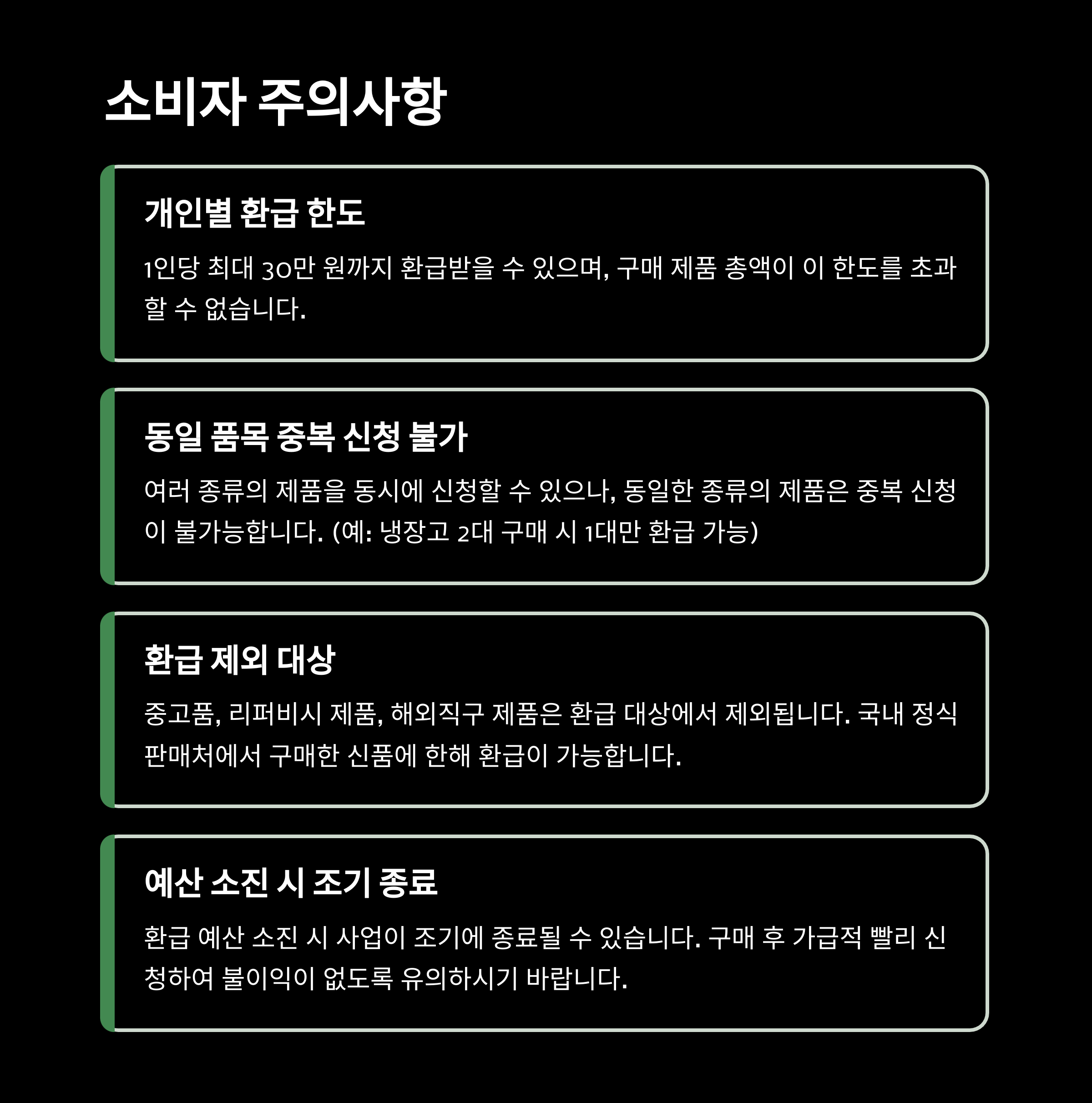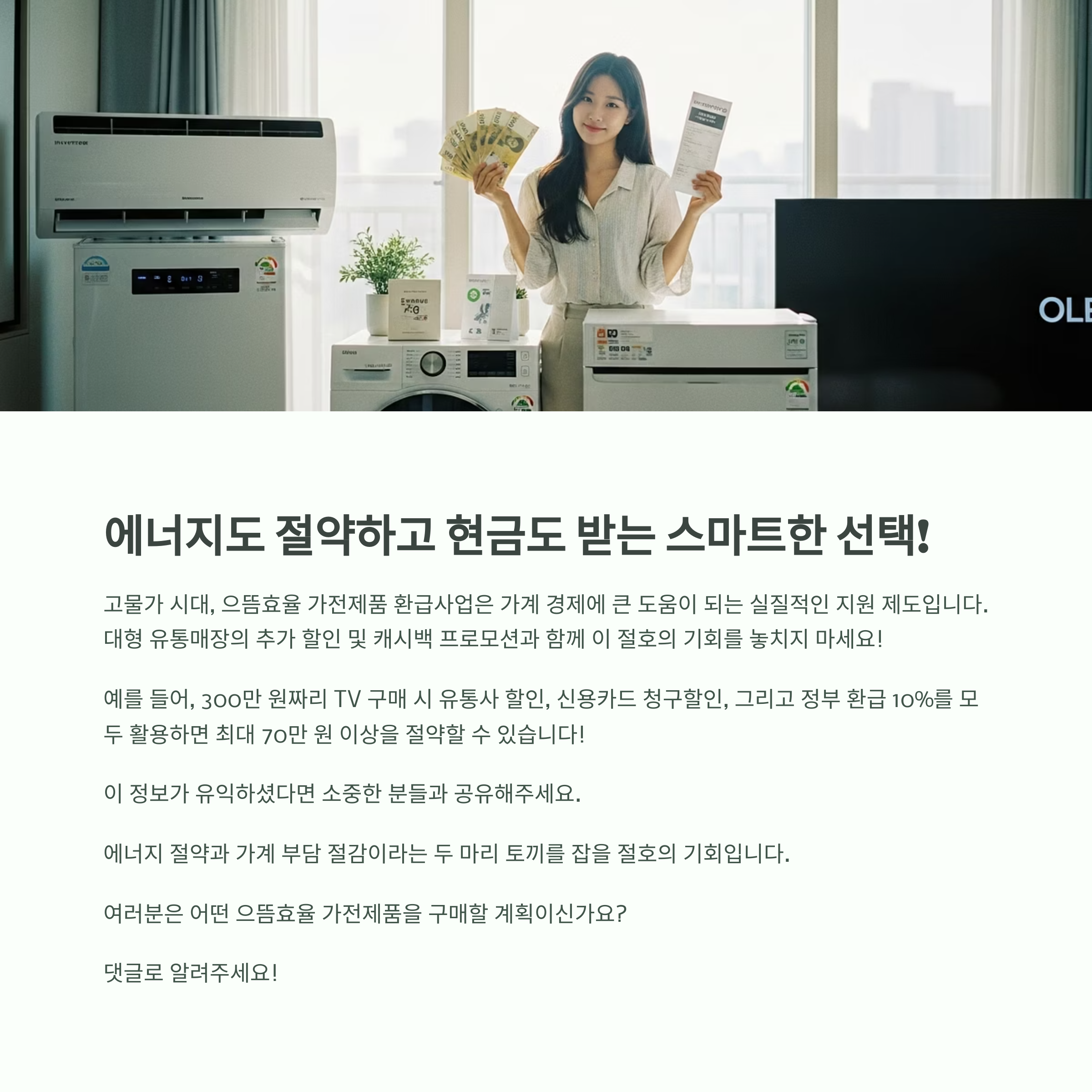 - 300만 원 TV 구매 시 → 유통사 자체 할인 + 신용카드 청구할인 + 정부환급 = 최대 70만 원 이상 절약