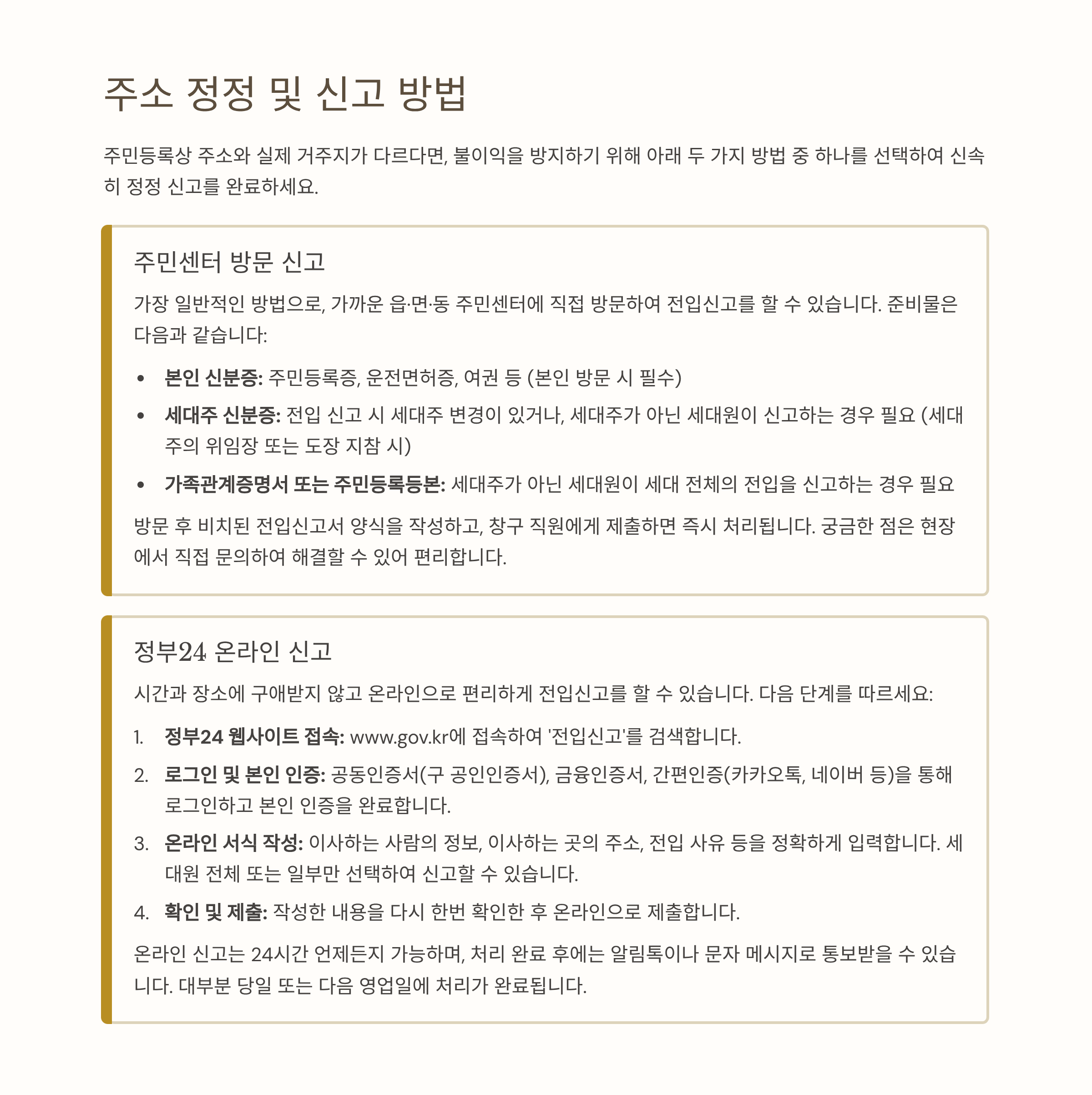 | 온라인 | 정부24 홈페이지에서 전입신고 및 변경 처리 가능 |