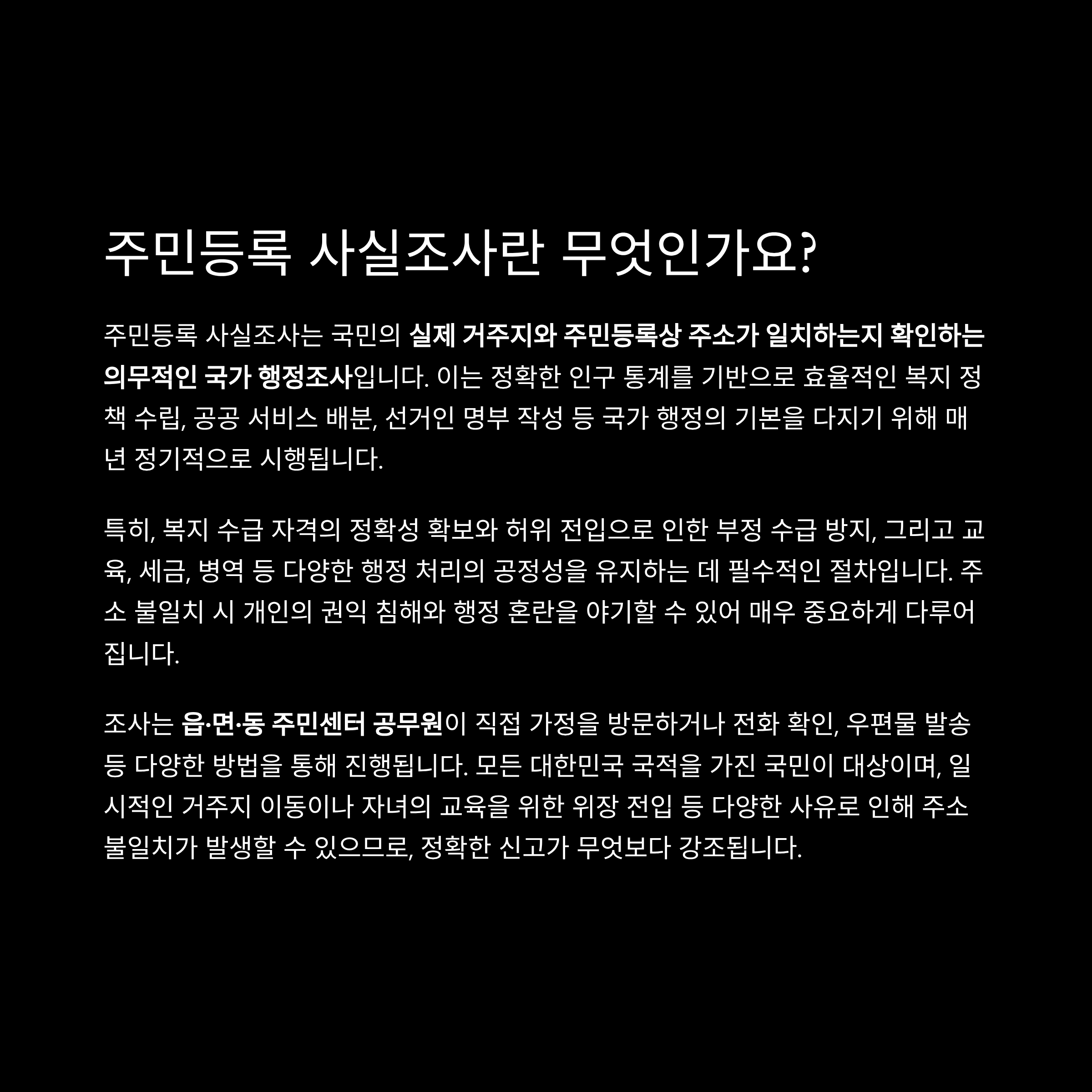 이는 인구 현황 파악, 복지 대상자 선별, 선거 및 각종 행정 절차의 정확성을 확보하기 위한 필수 절차입니다.