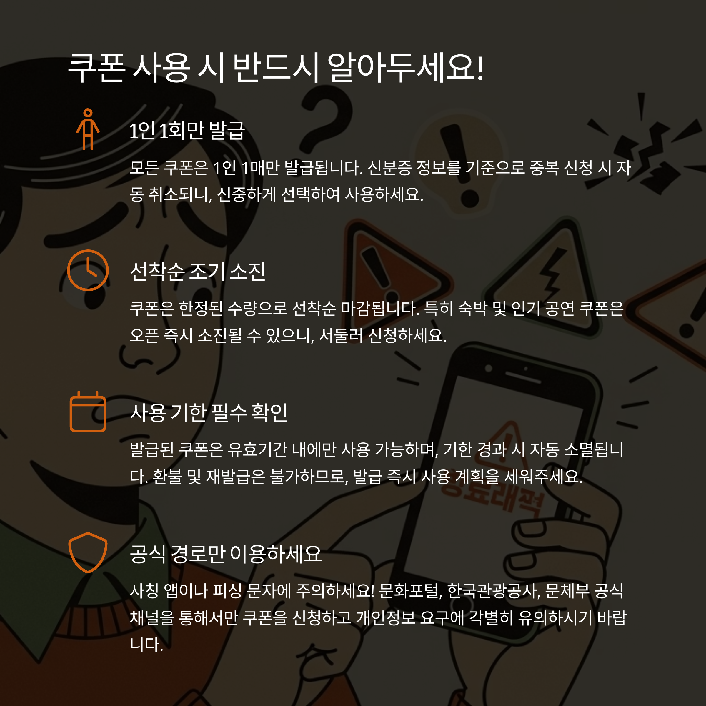 - 모든 쿠폰은 1인 1매 기준이며 중복 발급 및 양도 불가