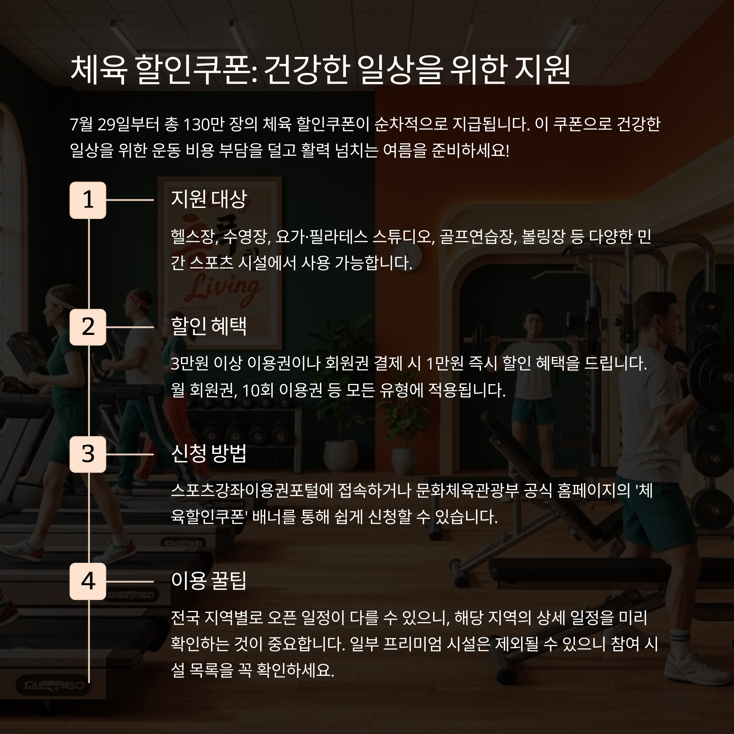 - 지원 방식: 체육시설 3만 원 이상 이용 시 1만 원 할인