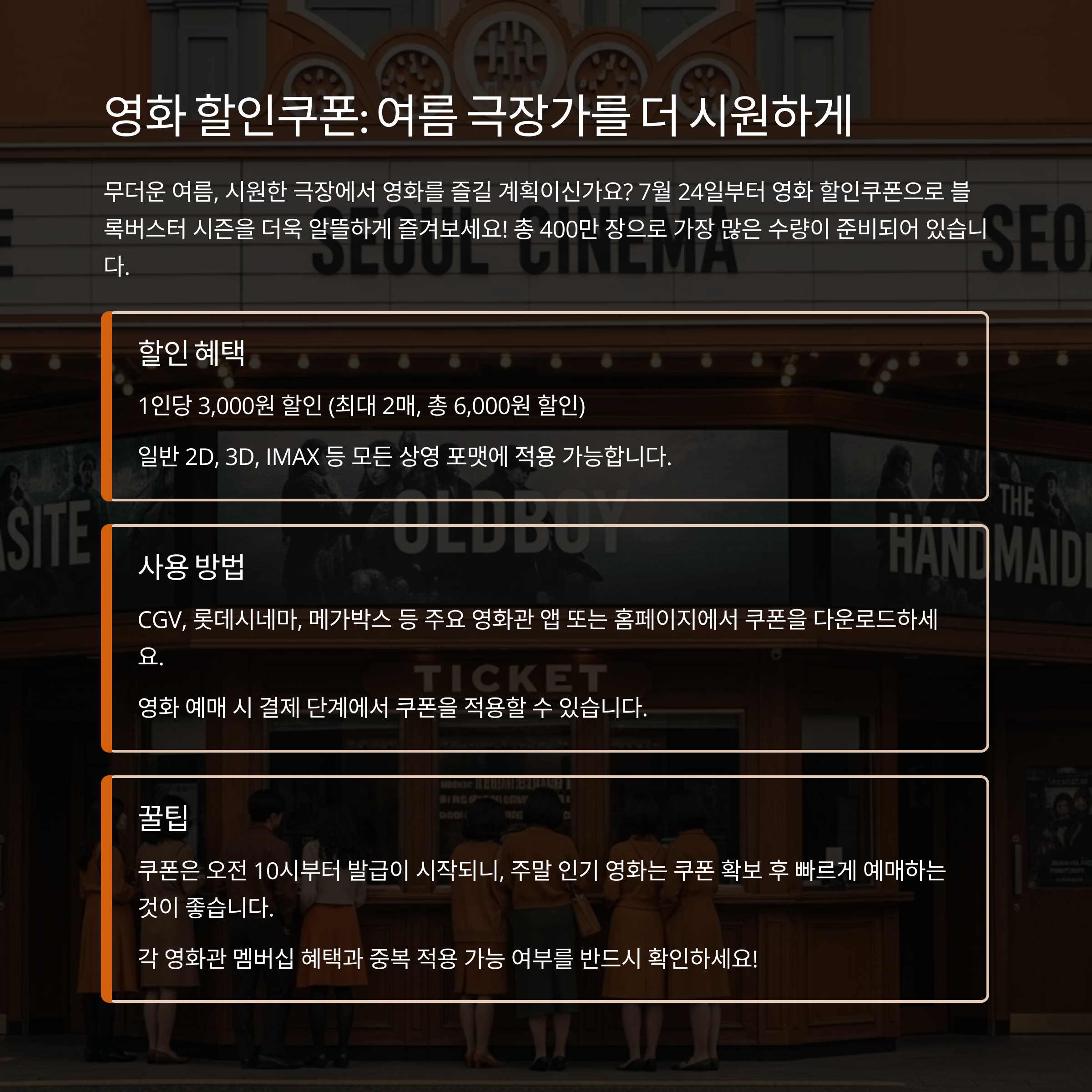 - 신청 방법: 각 극장사 홈페이지 또는 앱에서 쿠폰 다운로드