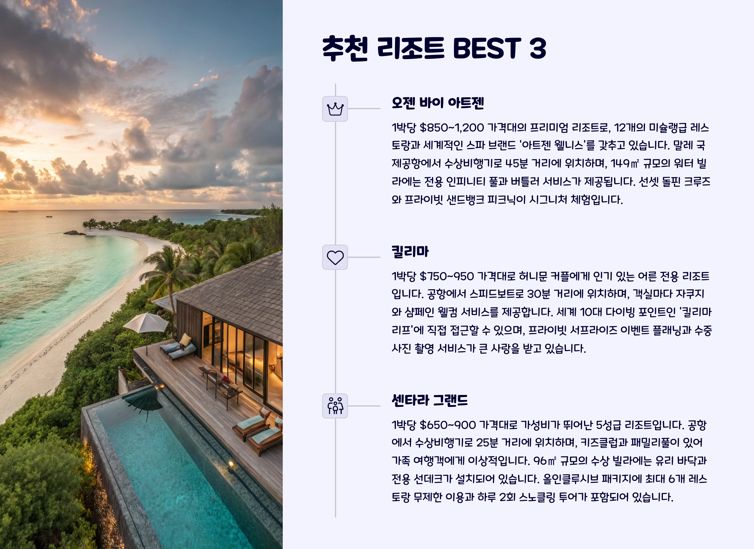 추천 리조트 중 '오젠 바이 아트젠'은 수상비행기로 이동 가능하며, 객실 내 미니바, 스노클링 장비 대여, 고급 레스토랑 이용까지 모두 포함된 프리미엄 올인클루시브를 제공합니다. '킬리마 리조트'는 한국인 신혼부부에게 가장 인기 있는 곳으로, 조용한 섬 분위기와 프라이빗한 구조가 특징입니다. '센타라 그랜드'는 가족 단위 고객에게 인기 있으며, 키즈 클럽과 스파 시설이 완비되어 있습니다.