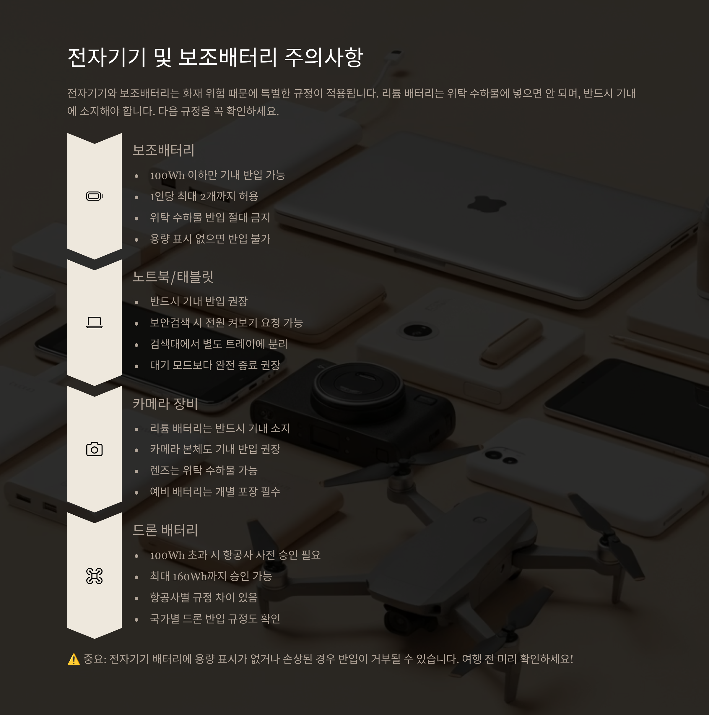 - 드론 배터리: 100Wh 초과 시 항공사 사전 승인 필요