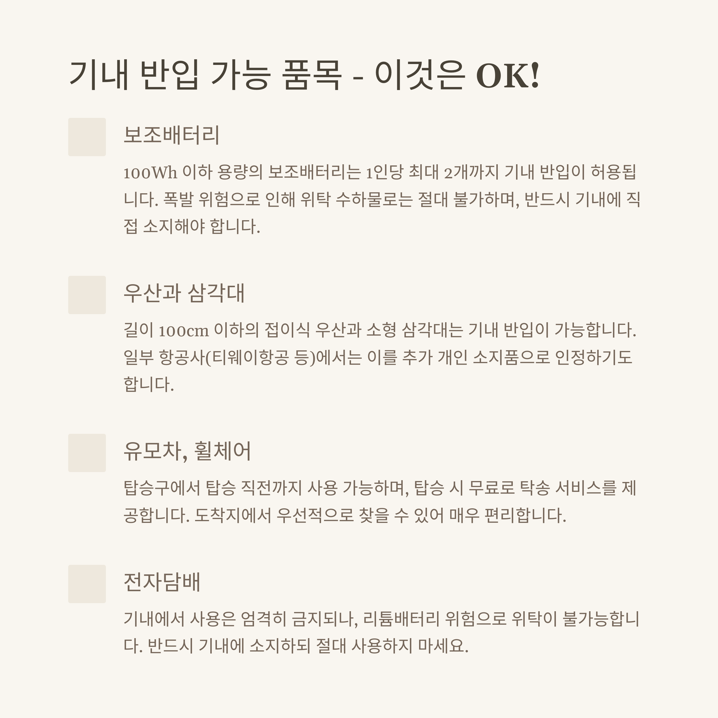 - 보조배터리: 100Wh 이하만 기내 소지 가능 (2개까지)