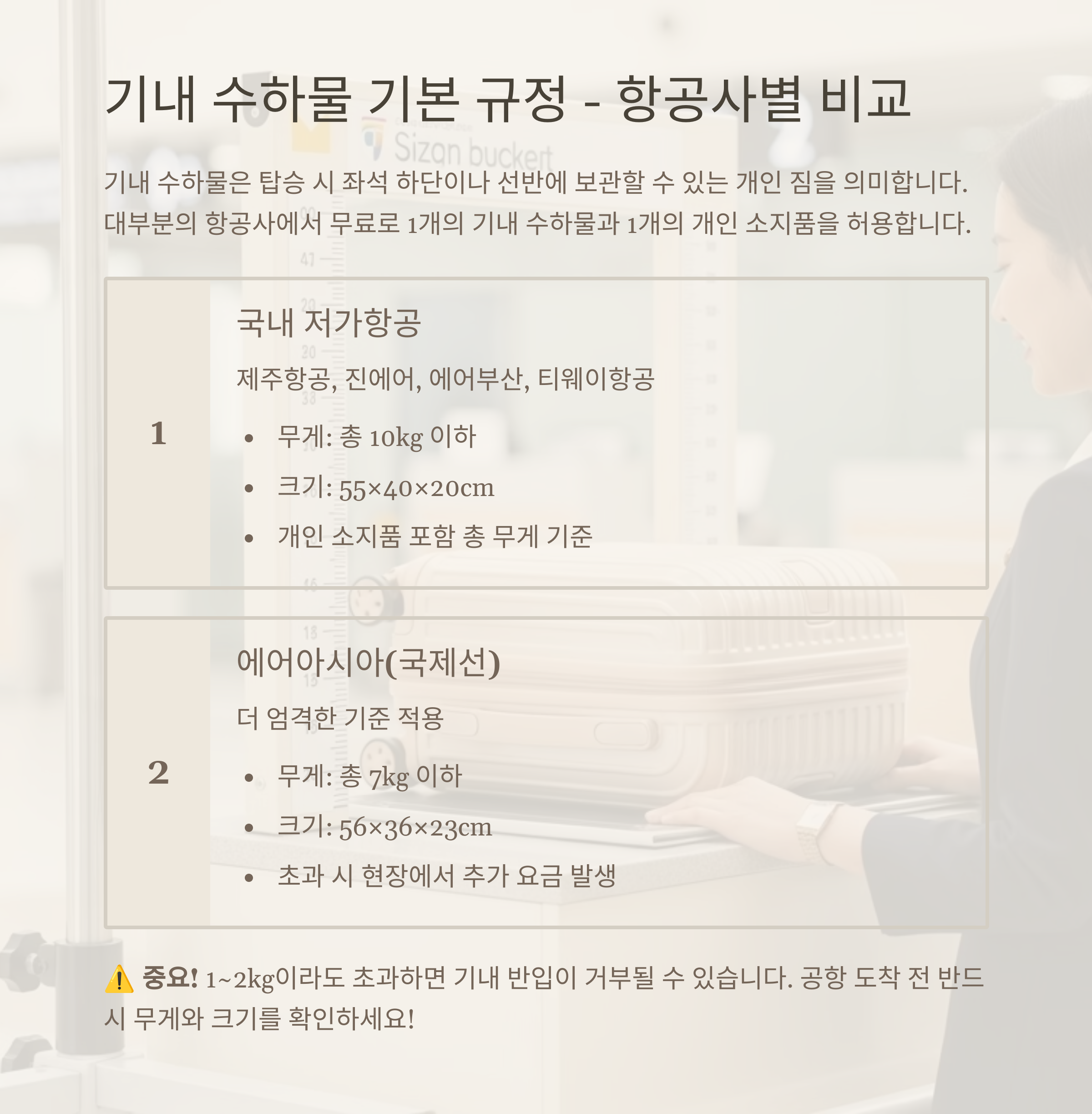 | 에어부산 | 총 10kg 이하 | 55×40×20 | 기내용 캐리어 1개 + 소지품 1개 허용 |