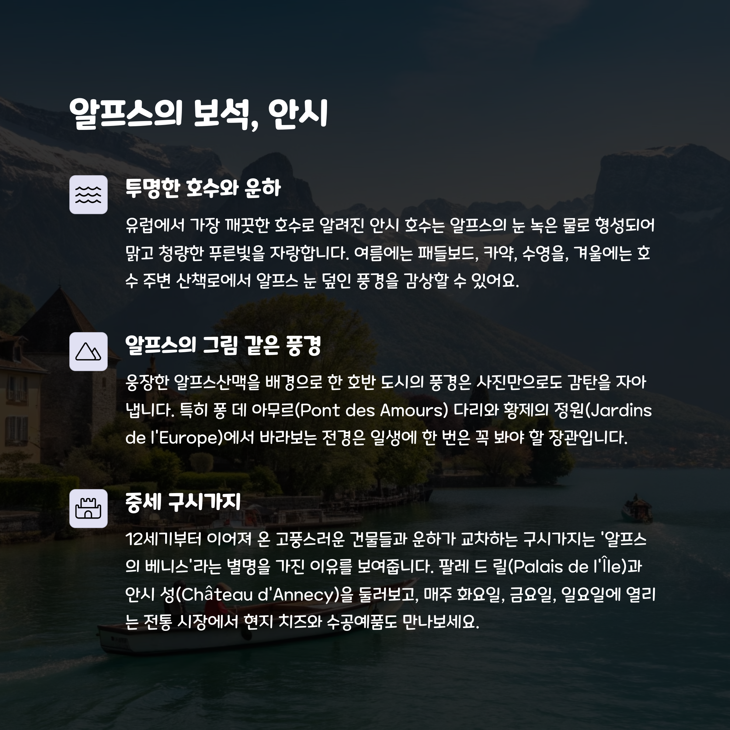 | 안시 (Annecy) | 호수, 운하, 재래시장, 알프스 | 제네바 공항 → 버스 1시간 |