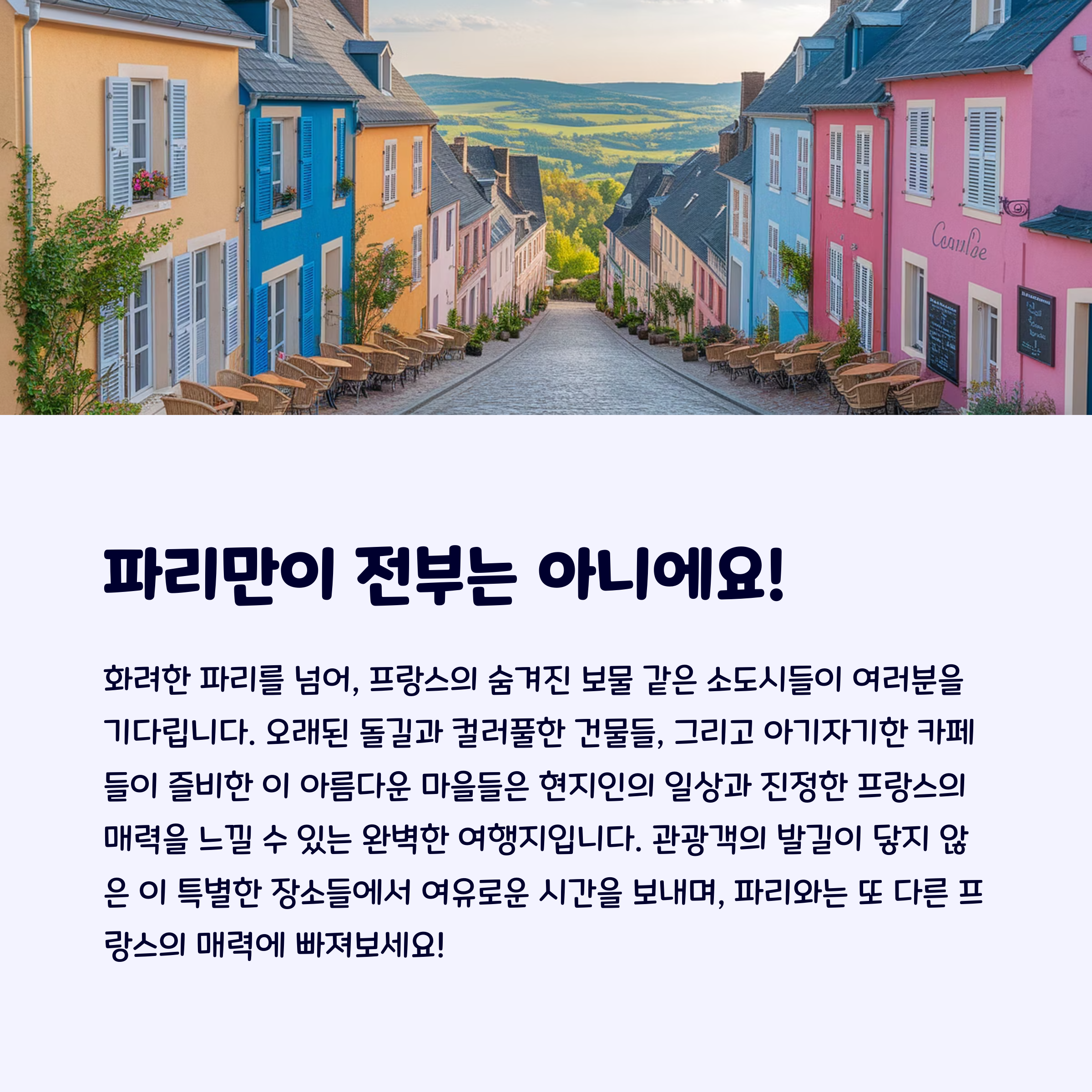 파리만으로는 아쉬운 당신에게, 프랑스의 진짜 감성을 느낄 수 있는 소도시 여행은 최고의 선택입니다. 안시, 아를, 콜마르 각각의 매력을 따라 천천히 걷고, 풍경을 음미하며 프랑스의 여유로운 시간을 만나보세요.