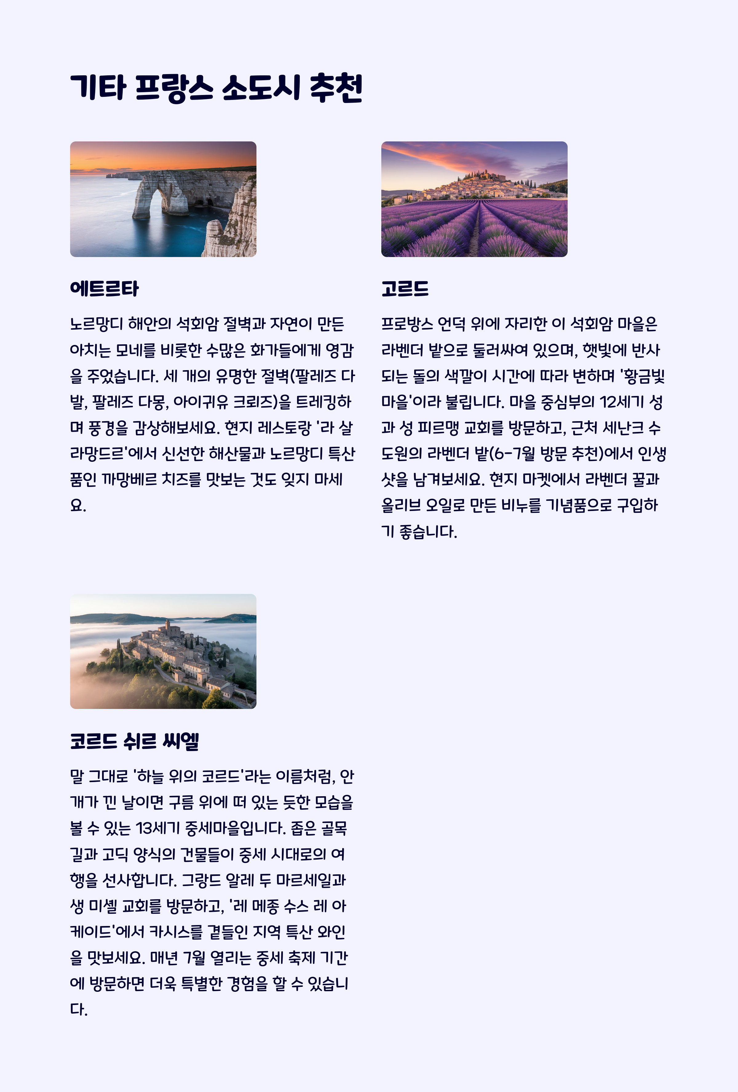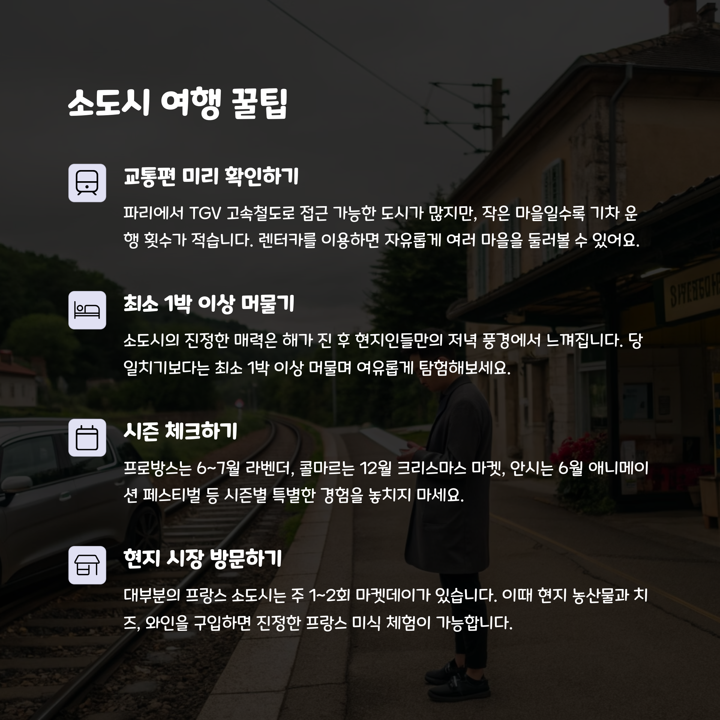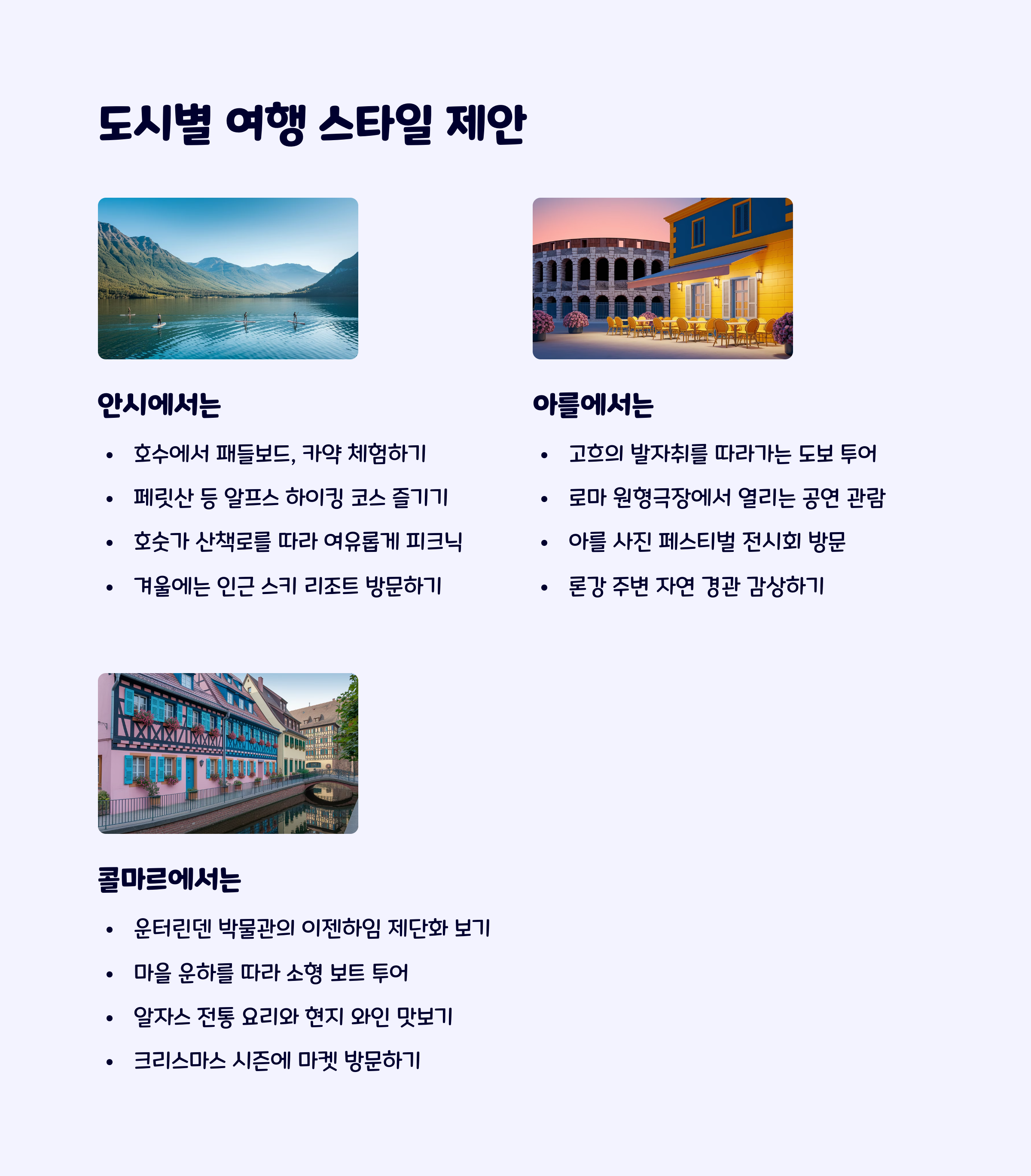 | 추천 도시 | 안시 – 알프스 호수 마을 / 아를 – 고흐의 도시 / 콜마르 – 동화 같은 중세 마을 |