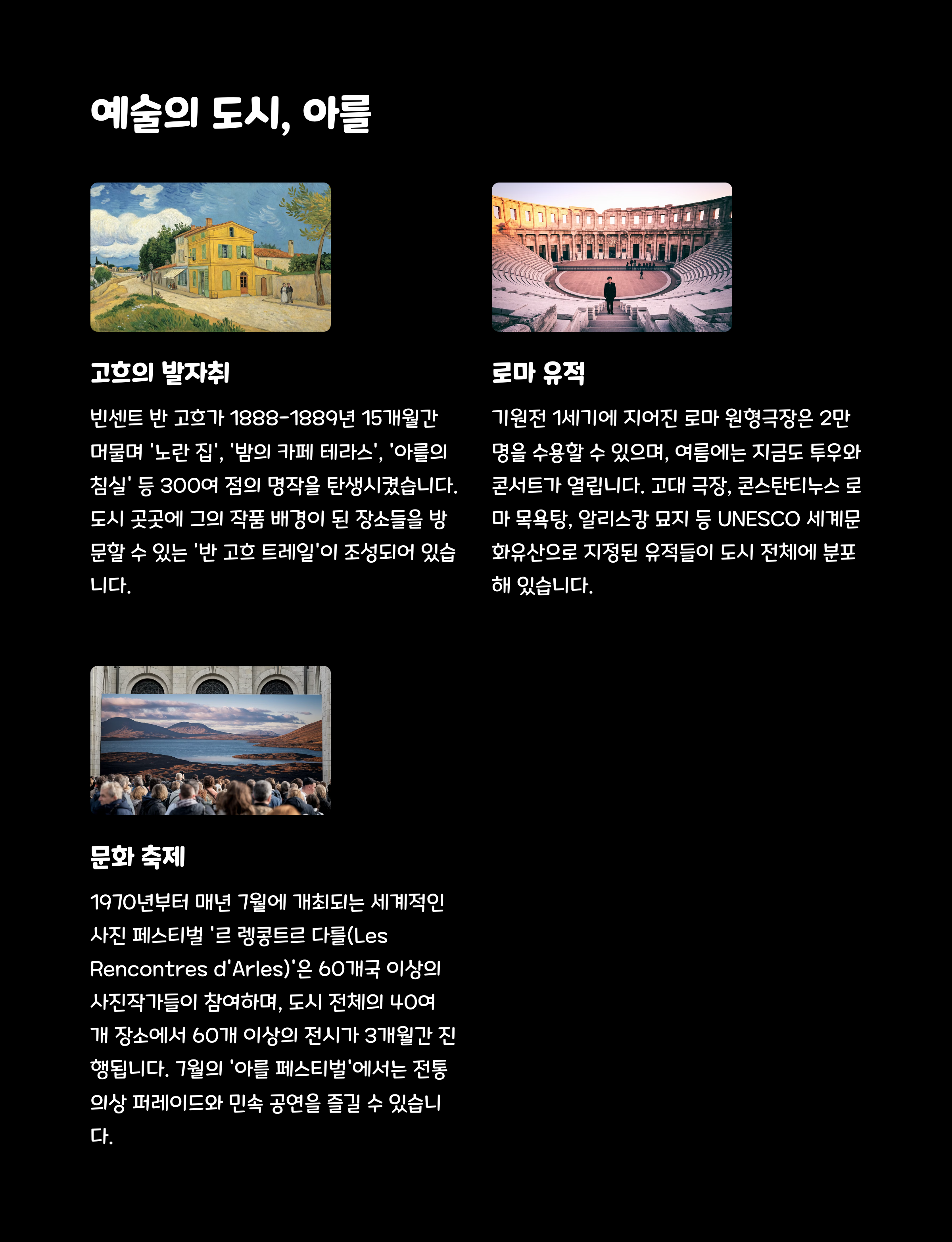 남부 프로방스에 위치한 아를은 고흐의 작품 배경이 되었던 실제 장소입니다. 아를 원형극장, 고흐 카페, 론 강변 등 도시 전체가 한 편의 명화처럼 구성돼 있죠. 낮에는 강렬한 햇살이 비추고 저녁에는 석양이 도시에 황금빛을 덧칠합니다. 매년 열리는 아를 사진 페스티벌과 현지 와인 바도 꼭 들러보세요. 파리에서 TGV로 4시간이면 도착할 수 있어요.