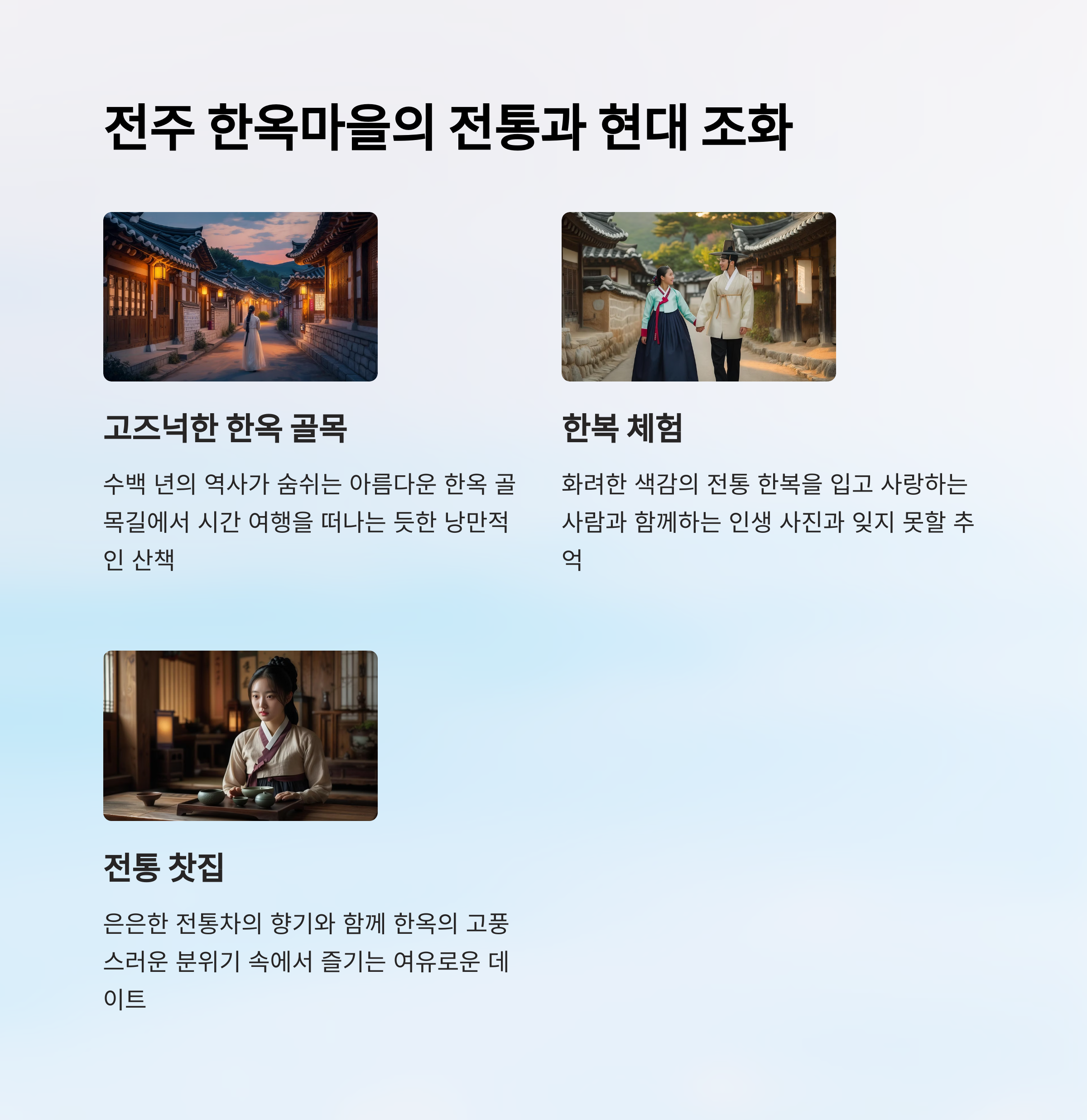"전주 한옥마을은 한국의 멋과 감성을 동시에 느낄 수 있는 곳입니다."