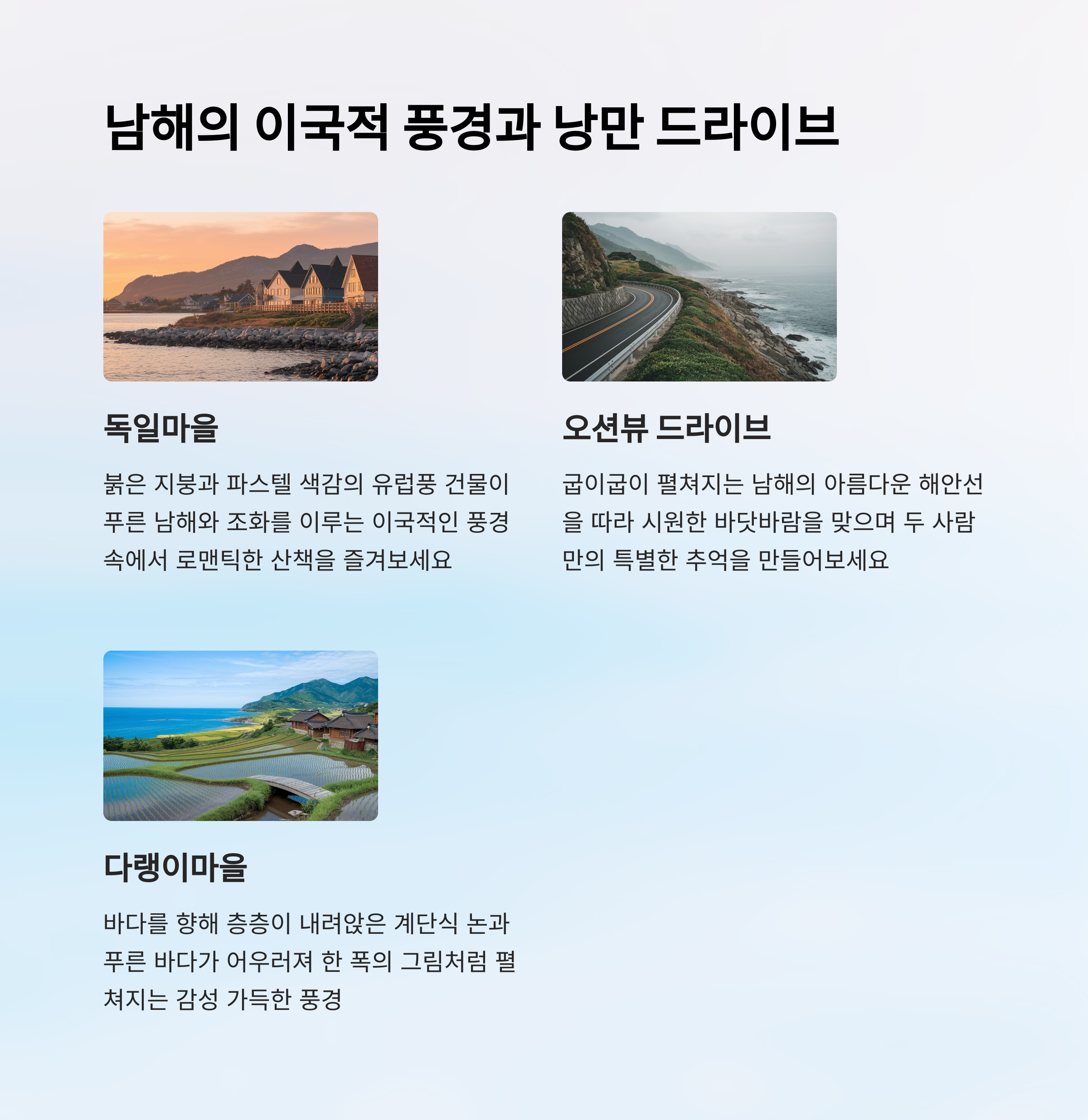 독일마을의 이국적인 분위기, 다랭이마을의 정겨운 풍경이 매력적으로 다가옵니다.